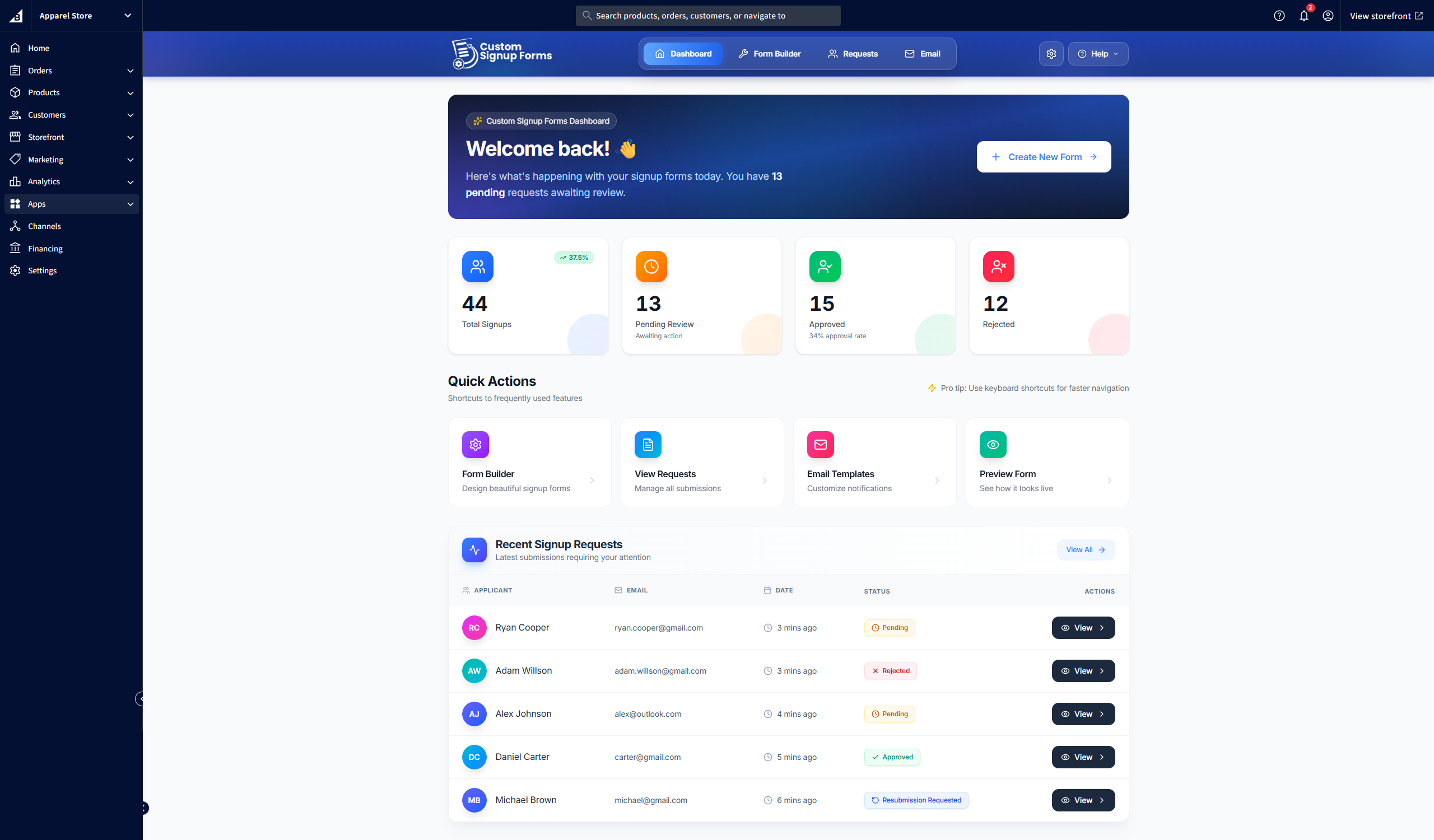 After installation, click on the Apps tab in the BigCommerce admin panel sidebar and select Custom Signup Forms. You'll be redirected to the Dashboard where you can get an overview of signup requests and access key features.