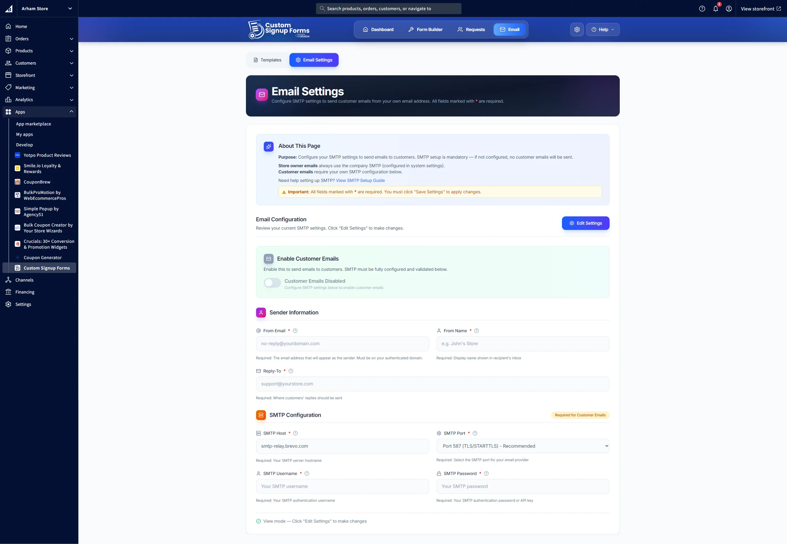 Before creating forms, navigate to the Email section to configure your SMTP settings. This ensures email notifications are sent correctly when customers submit signup requests.