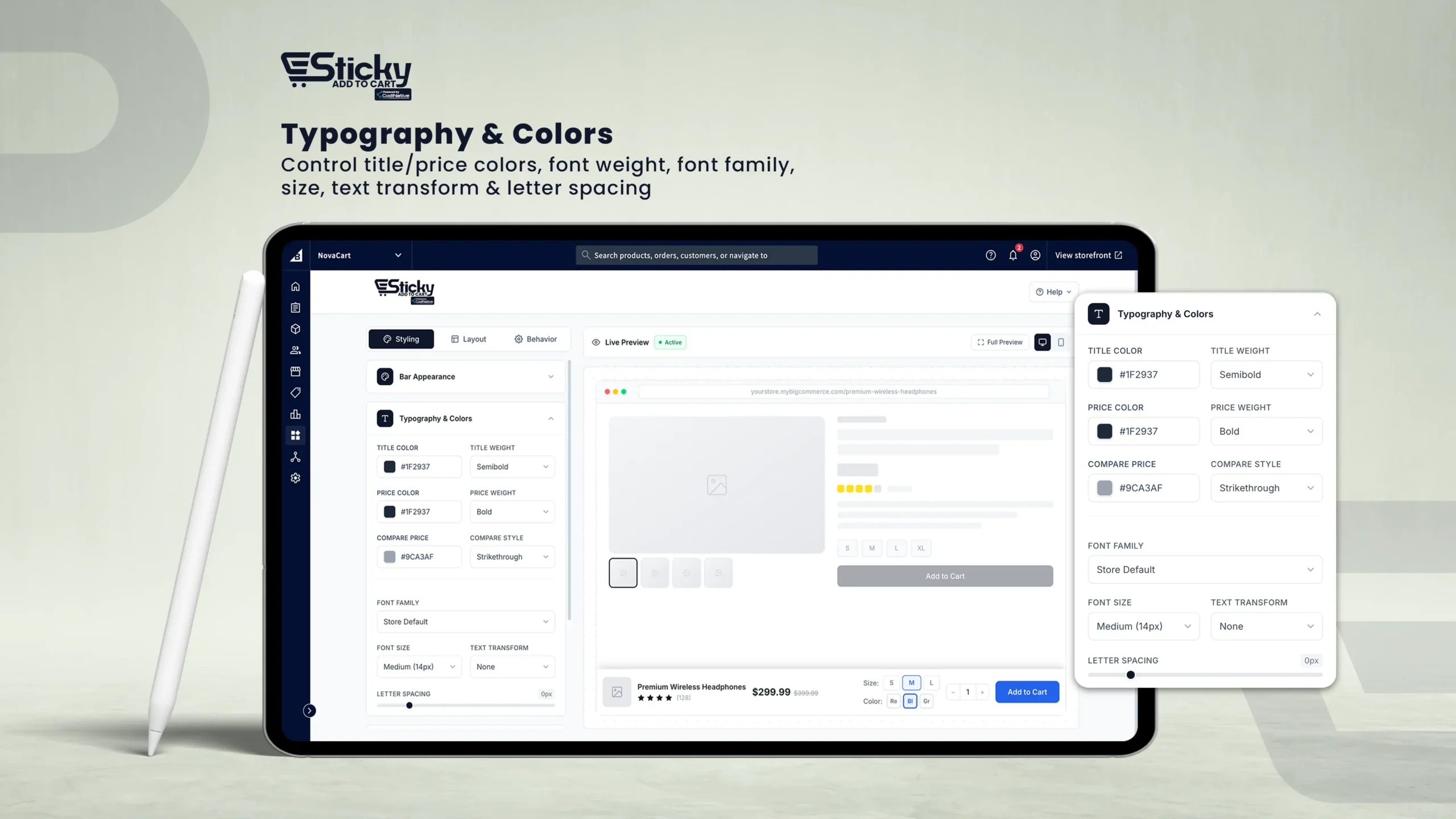 The live preview uses a sample product ("Premium Wireless Headphones") with placeholder data. Actual product name, price, and images come from BigCommerce automatically.