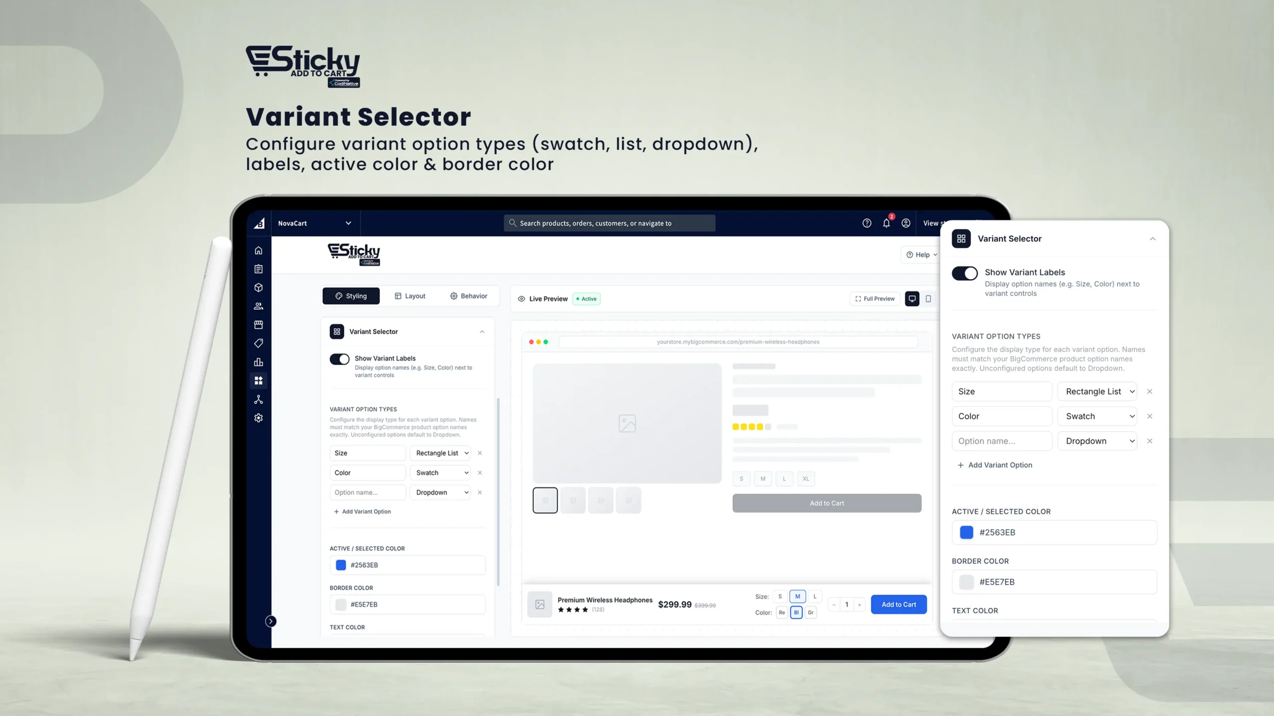 - Option names under Styling › Variant Selector must match your BigCommerce product option names exactly (case-insensitive).